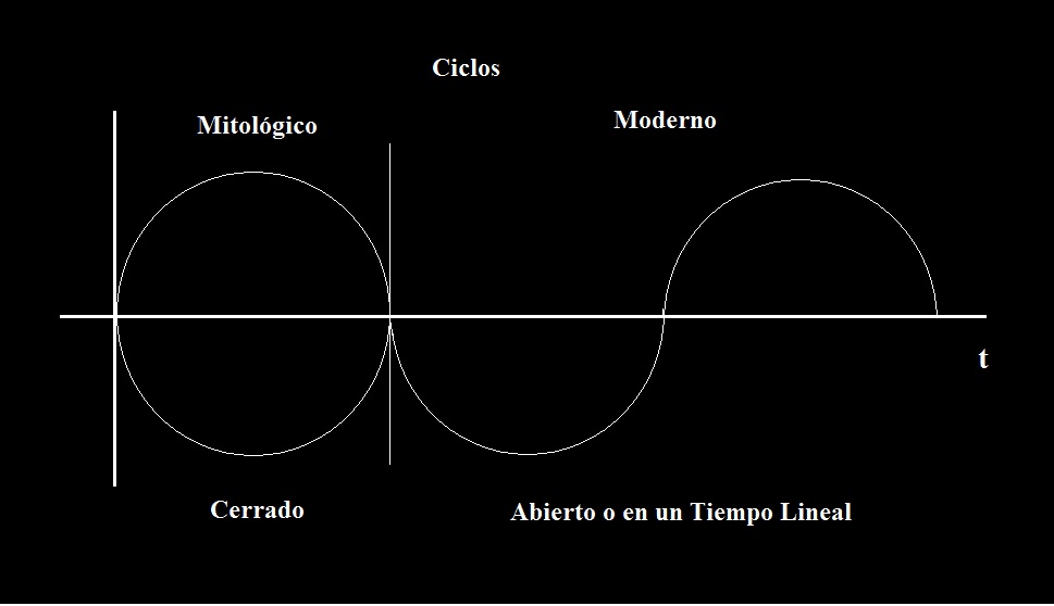 Interpretación gráfica de la filosofía de la historia en forma cíclica, en ciclos cerrados, propia de la mitología; y en ciclos abiertos en un tiempo lineal.